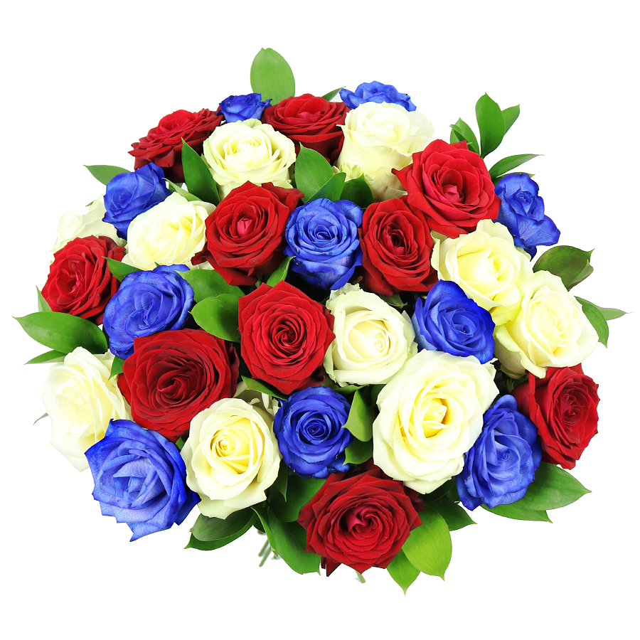 This arrangement features blue, white and red roses all combined with Ruscus. A great choice for a birthday gift, or as a table centrepiece at home.