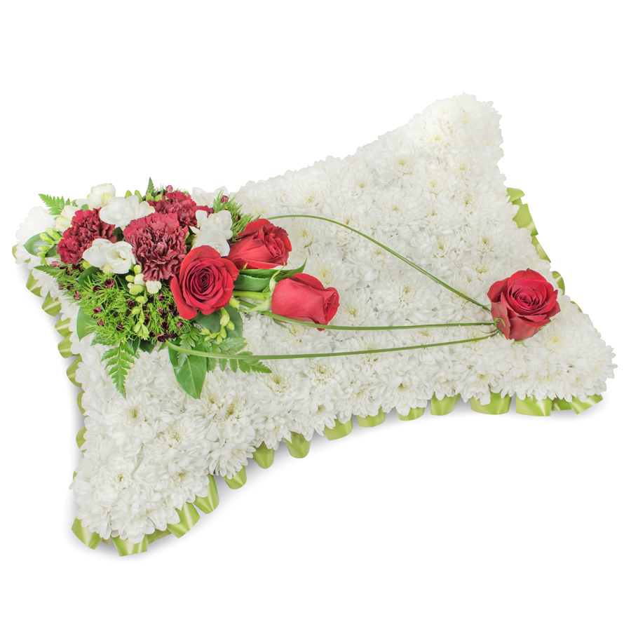 Express your deepest condolences with the Sincerest Sentiments Cushion from Bexleyheath Flowers, Bexleyheath. This elegant floral tribute is thoughtfully designed in a soft cushion shape, symbolising comfort and peace for your loved one. Featuring a bed of pristine white chrysanthemums, the arrangement is beautifully accented with rich red roses, delicate white freesias, and dark red carnations, all gently complemented by dianthus and graceful bear grass for added texture and elegance.